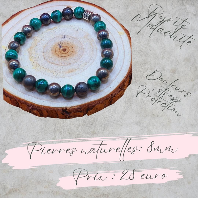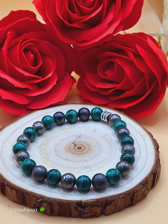 Bracelet perles naturelles 8mm, pyrite et malachite, montées sur fil élastique solide.