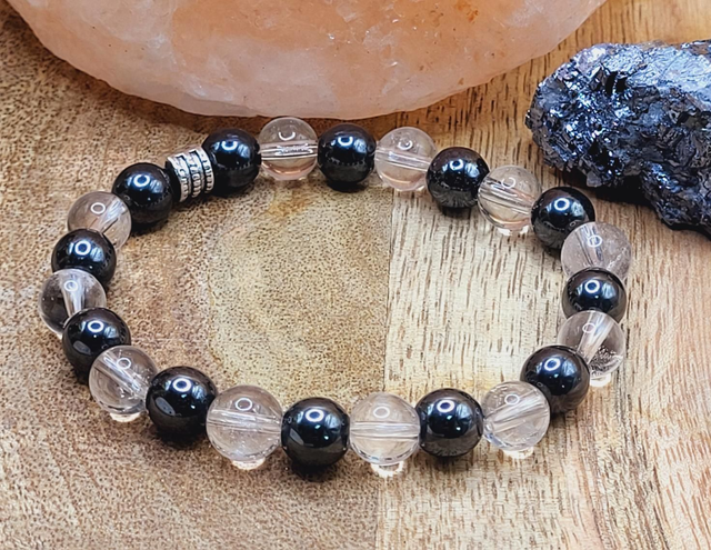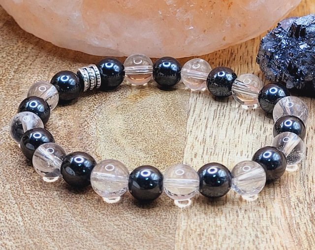 Bracelet hématite et cristal de roche 8mm montées sur fil élastique solide.