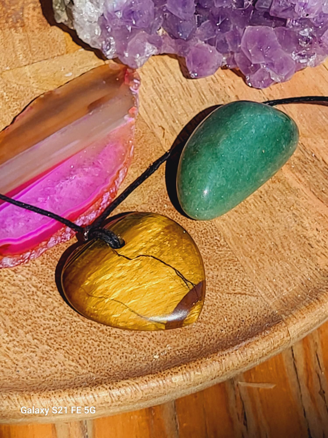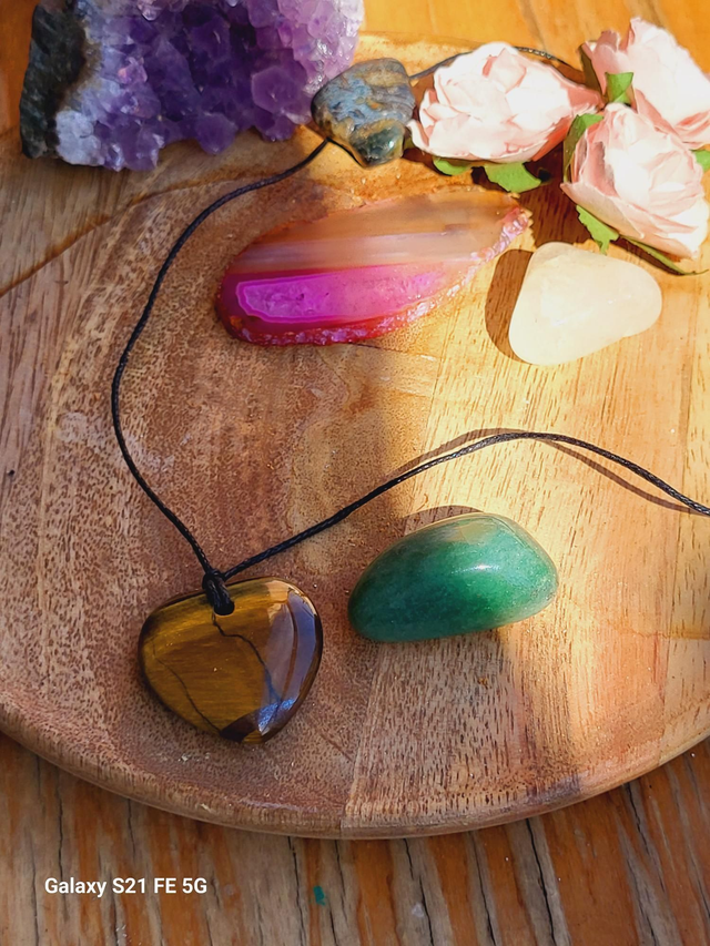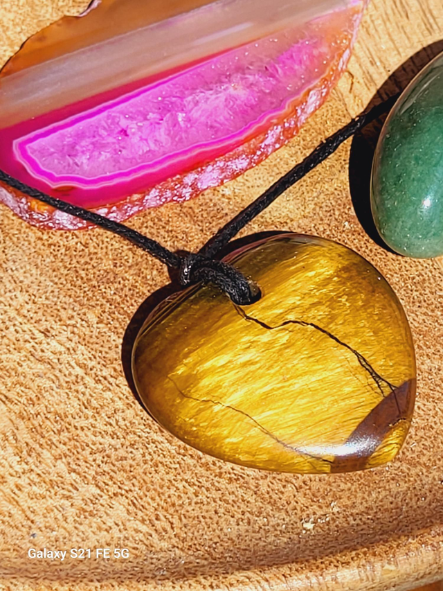 Collier sur cordon réglable, pierre naturelle en forme de cœur en œil de tigre.
