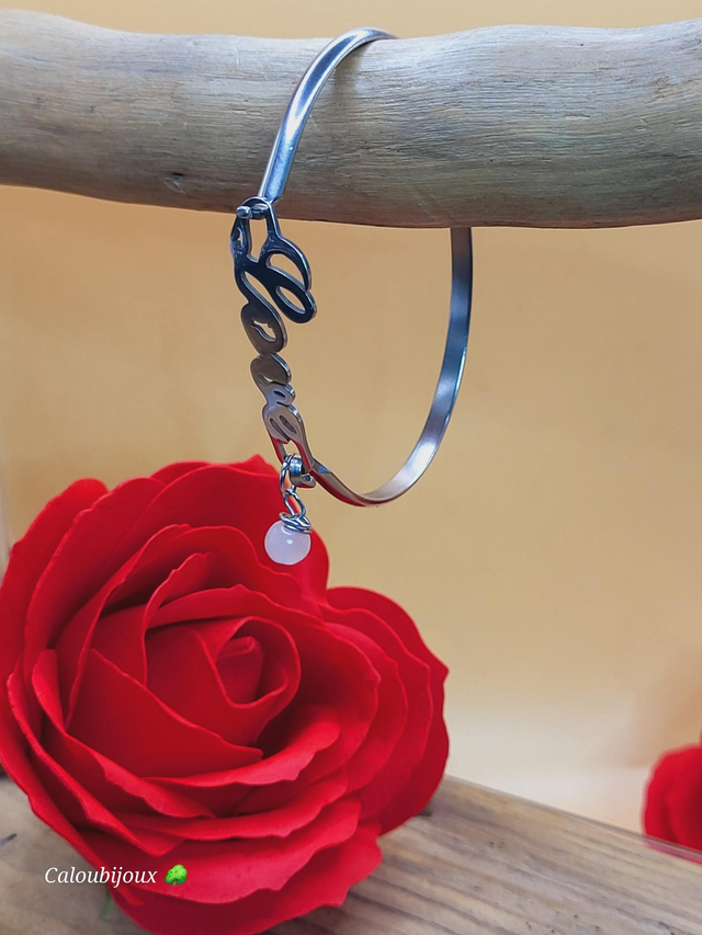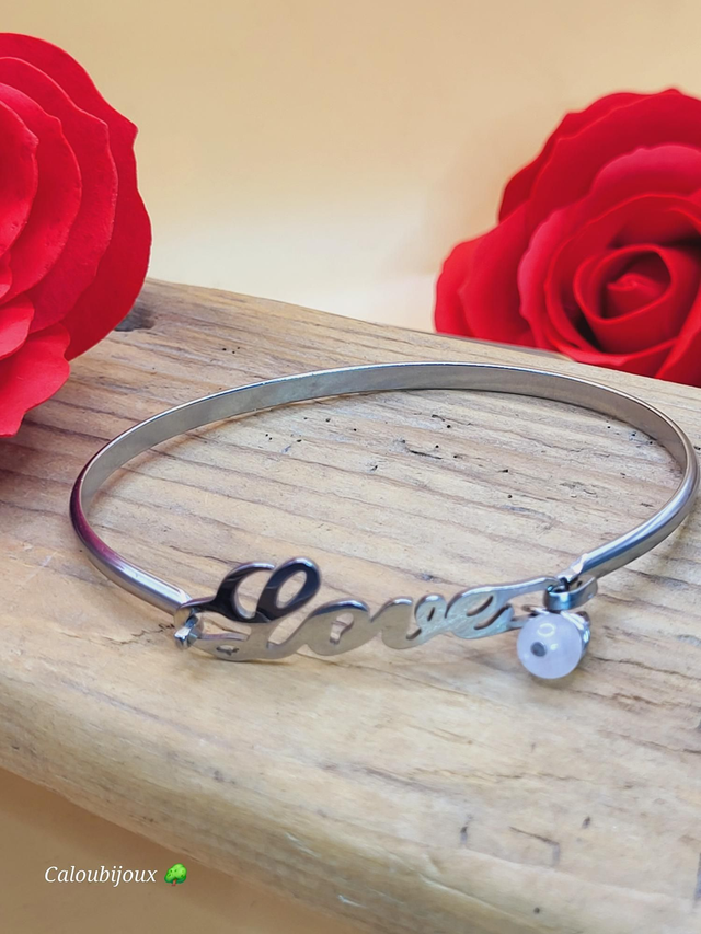 Jonc love acier inoxydable argenté, perle naturelle 6mm quartz rose