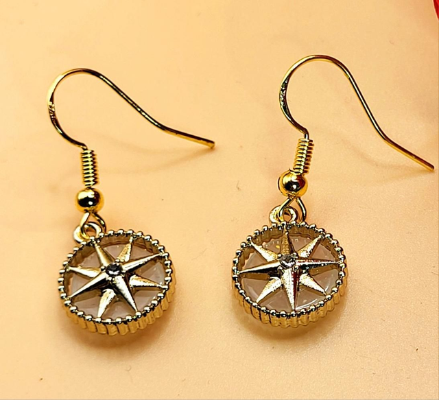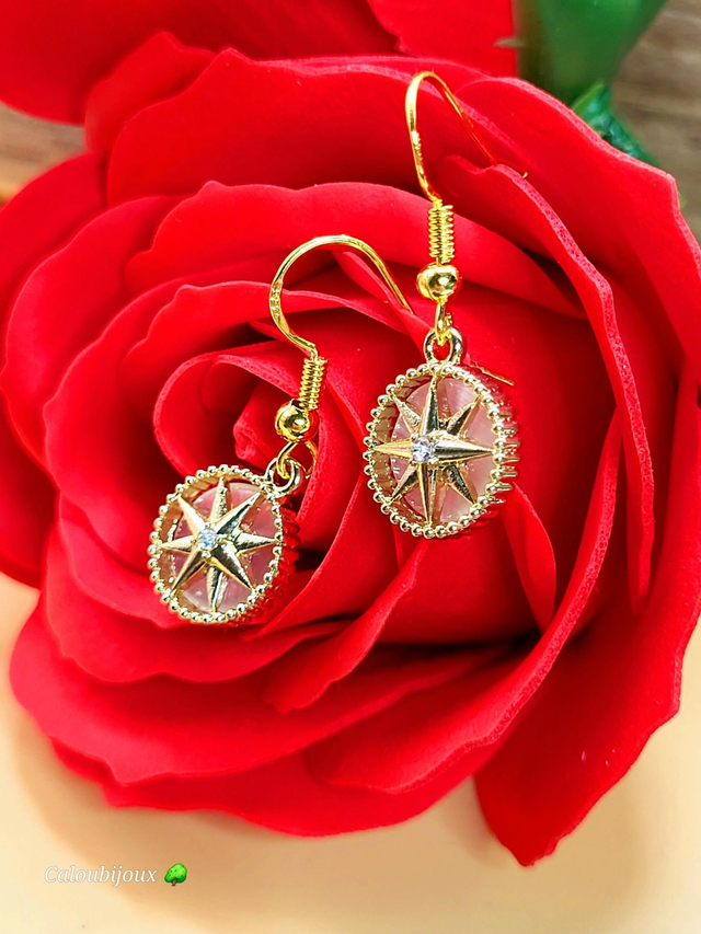 Boucles d'oreilles acier inoxydable doré, rose des vents, strass et nacre